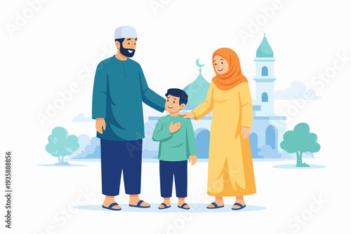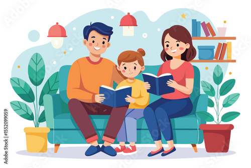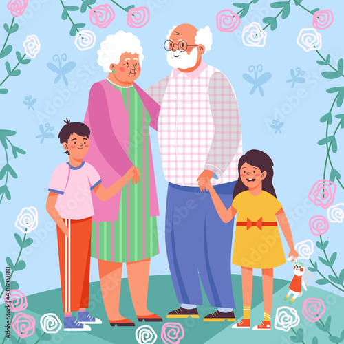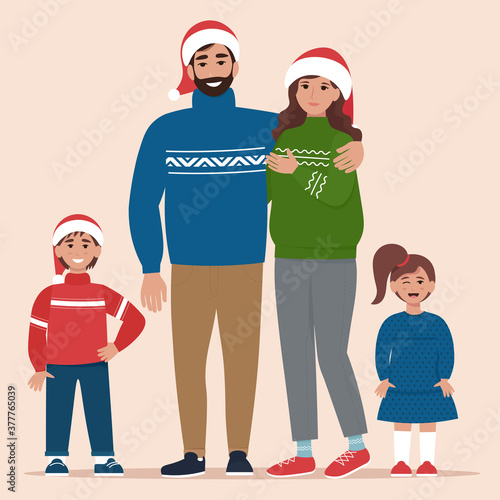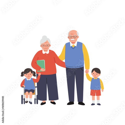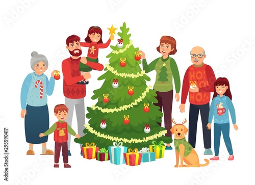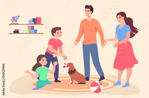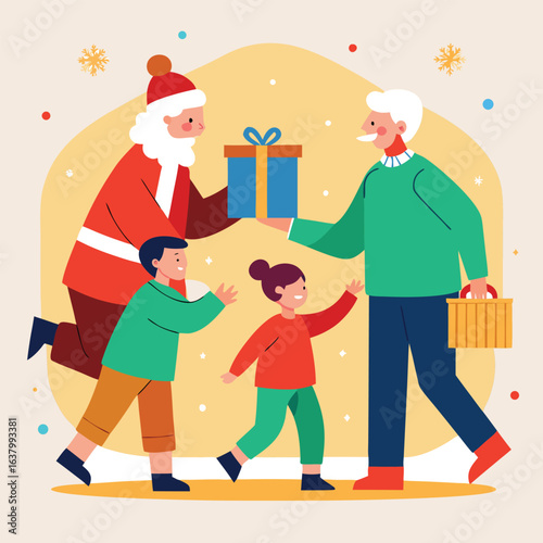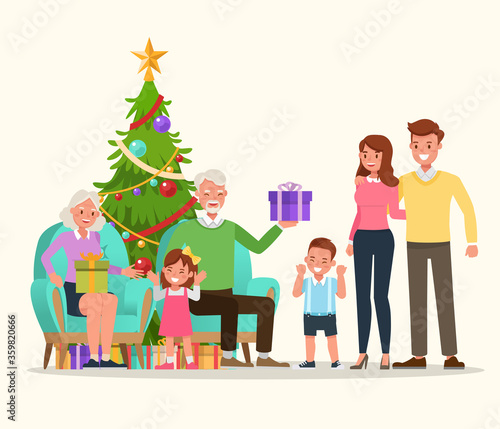 Вектор праздника новорожденного. Счастливые мать, отец и бабушка держат на руках малыша. Семья показывает ребенка младшей сестре, стоящей возле иллюстрации подарочной коробки. Любовь и сближение