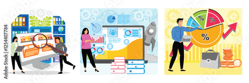 Набор шаблонов векторных плакатов для новостных СМИ. Люди читают печатные газеты, онлайн-новости, смотрят теленовости. Печать, вещание и интернет - основные виды средств массовой информации. Иллюстрация дизайна в плоском стиле.
