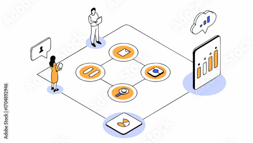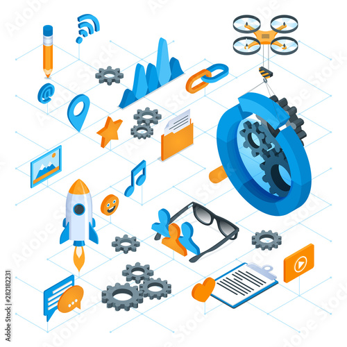 Офис компании по разработке игр NFT с открытым пространством, изометрическая 3d векторная иллюстрация. Группа людей, разработчиков программного обеспечения, программирует код с помощью портативного компьютера на рабочих местах