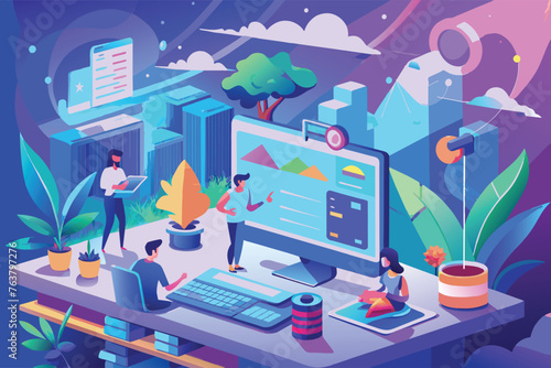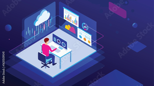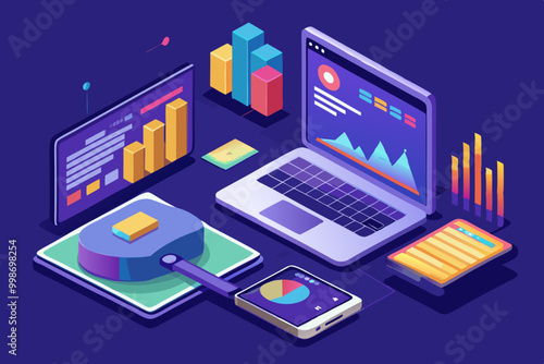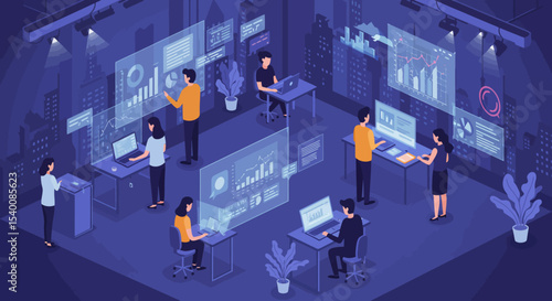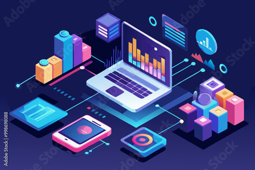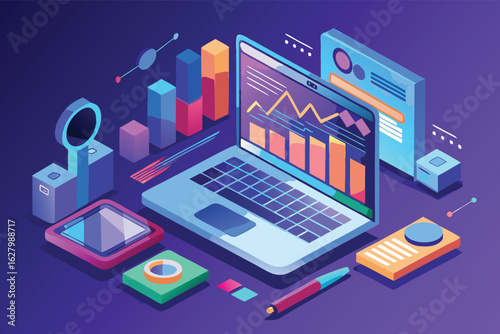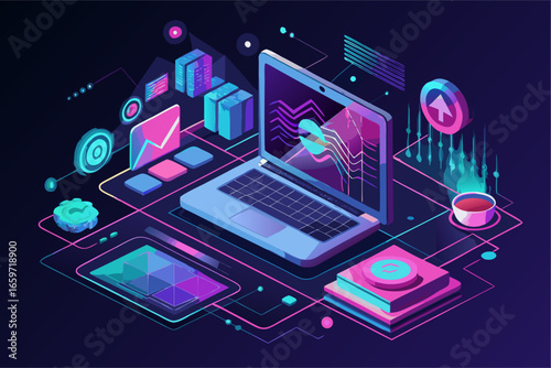 NFT, несменяемый токен, технология блокчейна цифрового криптоискусства, векторная изометрическая иллюстрация, дизайн неонового света.