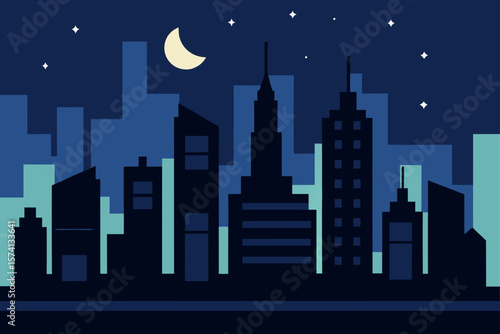 Затемнение ночного города, векторная иллюстрация. Городской пейзаж со звездным небом, луной и силуэтами небоскребов без электричества. Темный городской пейзаж. Отключение электроэнергии.