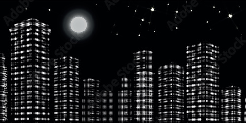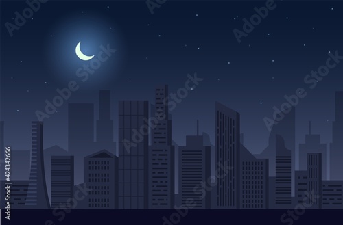 Затемнение ночного города, векторная иллюстрация. Городской пейзаж со звездным небом, луной и силуэтами небоскребов без электричества. Темный городской пейзаж. Отключение электроэнергии.
