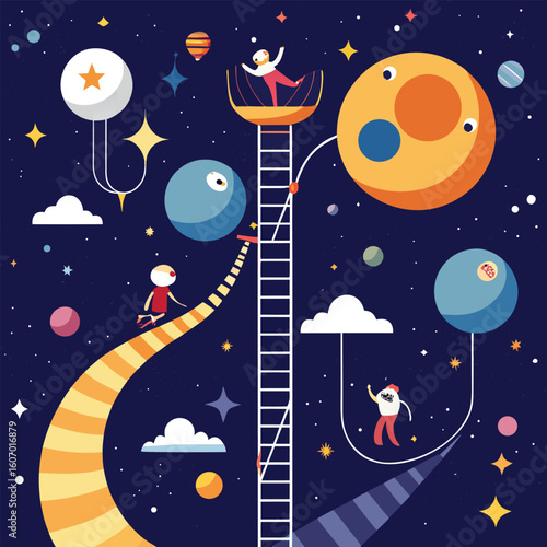 Ночное звездное небо с планетами солнечной системы, зодиакальными созвездиями, летящей ракетой и астронавтом, векторная иллюстрация в стиле бумажного искусства. Космическая сцена, астрономическая наука.