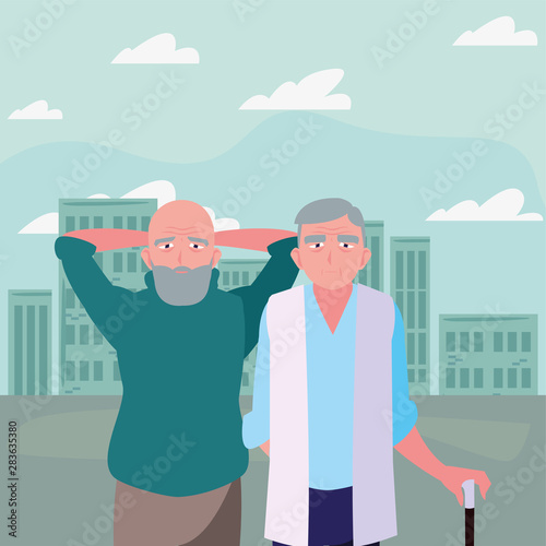 Плакат о шумовом загрязнении окружающей среды. Векторная иллюстрация людей, страдающих от громкого шумного городского звука. Мужчина и женщина закрывают уши, чтобы не слышать шума в ушах