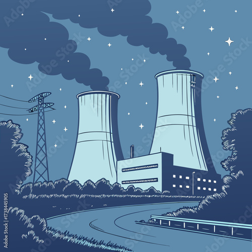 Атомная электростанция и завод. Промышленная концепция ядерной энергетики. Векторная иллюстрация в плоском стиле. Предыстория атомной станции.