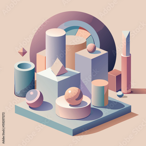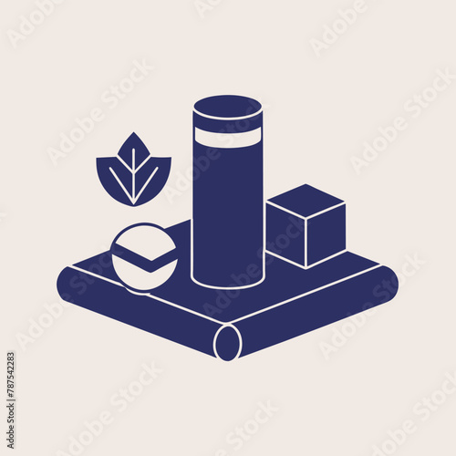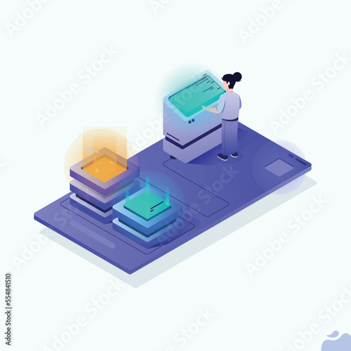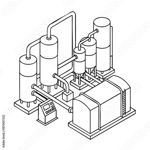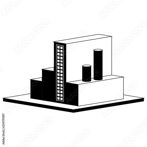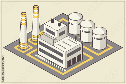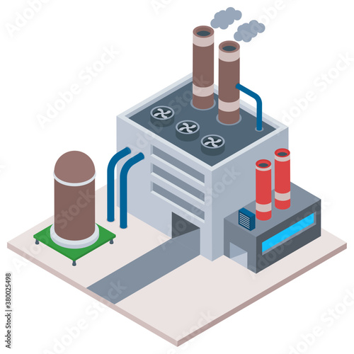 Изометрический вектор атомной электростанции. Завод по производству атомной энергии с реактором и объект по переработке промышленных отходов, выделенные на белом фоне