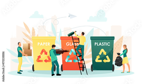 Векторная иллюстрация атомной электростанции с дымящимися трубами, человек в маске, рабочий толкает бочку с ядерным символом. Загрязнение воздуха, концепции невозобновляемой энергии для веб-баннера, веб-страницы.