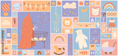 Интерьер детской комнаты ручной работы набор векторных иллюстраций. Современный дизайн интерьера дома. Мебель и аксессуары для комнаты новорожденного ребенка. Детская кроватка, красочные обои, детские игрушки, детская площадка.