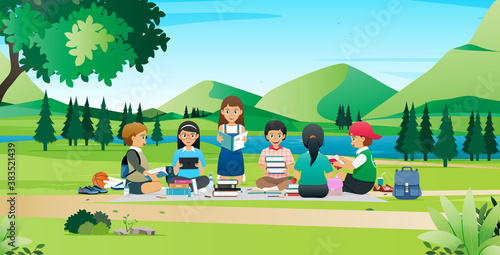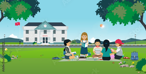 Иллюстрация дома престарелых. Векторные пожилые люди, пациенты и лица, осуществляющие уход, сиделки, медсестры или доктора. Пожилые люди проводят тренировку с тренером-инструктором, гуляют с воспитателем, разговаривают с посетителем