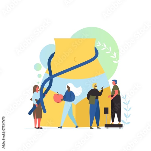 Векторная плоская иллюстрация концепции диетолога. Крошечные персонажи: девушка, измеряющая тонкий вес крупной женской фигуры, женщина-диетолог с яблоком, мужчина, стоящий на весах. Здоровое питание, диета для похудения.