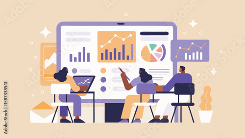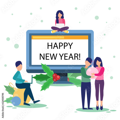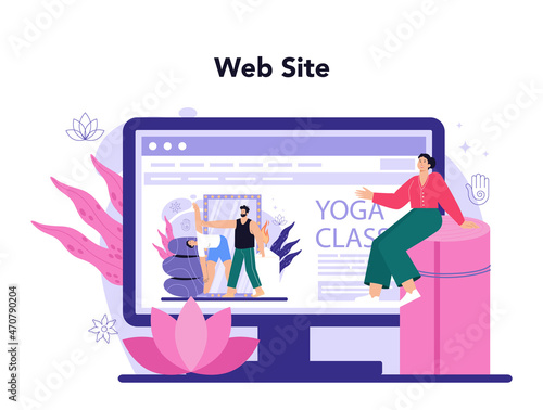 Векторная плоская иллюстрация концепции диетолога. Женская фигура с тонкой талией на большом мониторе компьютера, крошечные персонажи, диетолог, дающий яблоко женщине, делающей тесто, мужчина со скакалкой. Здоровый образ жизни