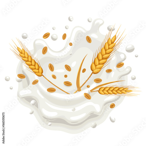 Набор для взбивания овсяного молока. Векторная реалистичная иллюстрация овсяных колосьев, цельного зерна, овсяных хлопьев в растительном молоке, разбрызгивающемся и заливающемся. Здоровое питание, сливочное и вкусное диетическое питание.