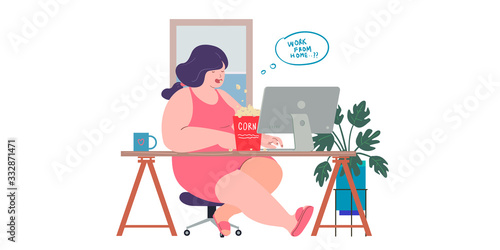 Ожирение и проблемы с весом. Грустная полная женщина в нижнем белье смотрит на себя в зеркало, плоская векторная иллюстрация. Нездоровое питание и образ жизни. Дисморфофобия.