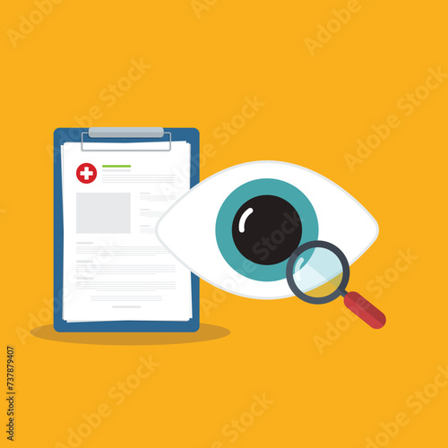 Векторная плоская иллюстрация окулиста. Таблица глазных тестов, глазные капли, очки, контейнер для контактных линз и флакон с раствором, рецепт. Офтальмология, оптометрия, набор корректирующих очков для детей и т.д.