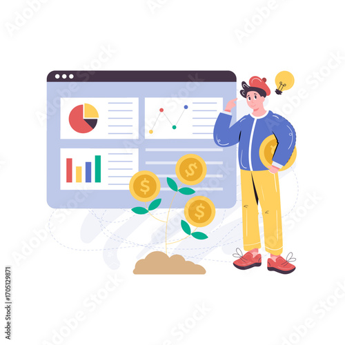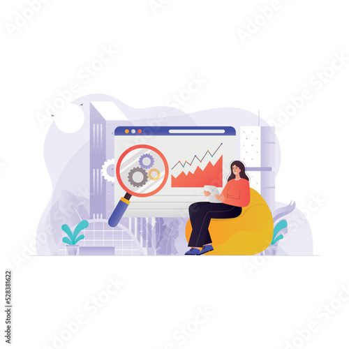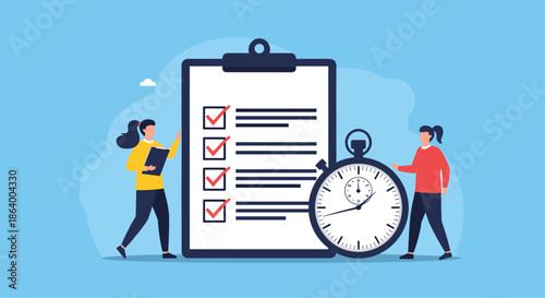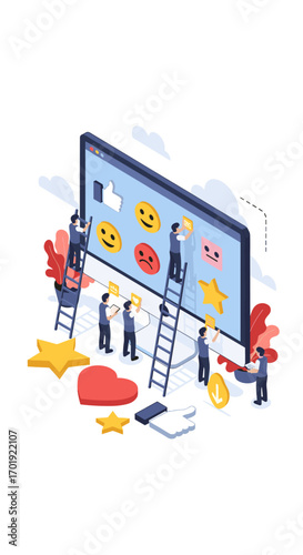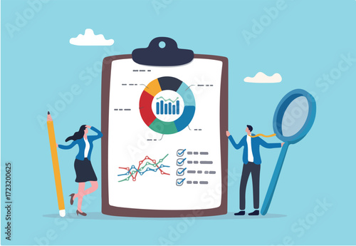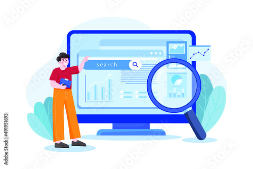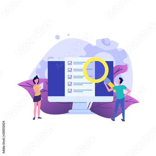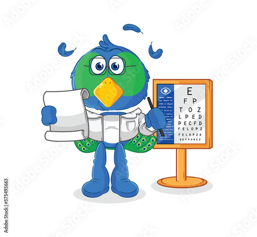 Векторная плоская иллюстрация окулиста. Крошечные персонажи пациент и врач, указывающие на таблицу глазных тестов на большом компьютерном мониторе. Оптометрия, офтальмологическая диагностика, концепция тестирования и коррекции зрения.