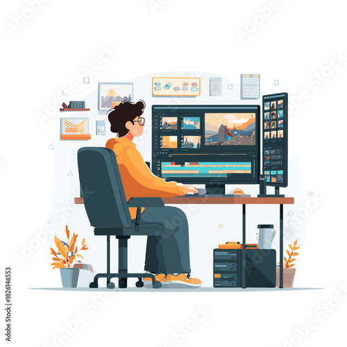 Офисное рабочее место и мультяшные персонажи бизнесмена обсуждают что-то во время работы на компьютере, стоя возле стола с планшетом в руке, векторная плоская иллюстрация. Ежедневная рутинная работа бизнесмена.