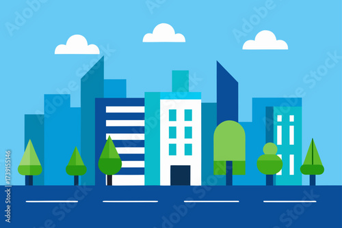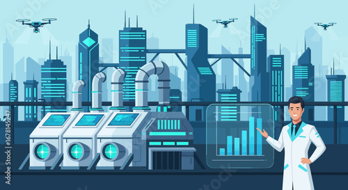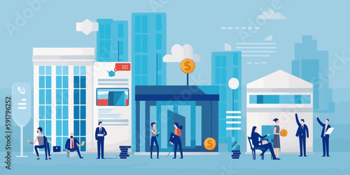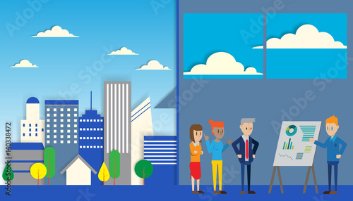 Концепция дизайна интерьера офиса и бизнес-команды. Векторная иллюстрация в стиле вырезания бумаги. Люди в офисе с городскими зданиями на заднем плане.