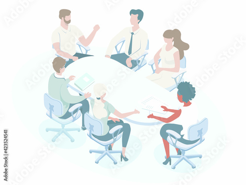 Сцена офисной жизни, векторная иллюстрация в стиле бумажного художественного ремесла. Силуэты группы деловых людей, проводящих семинар, совещание, планирующих, дающих презентацию. Командная работа, офисные ситуации.