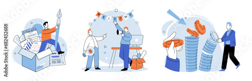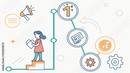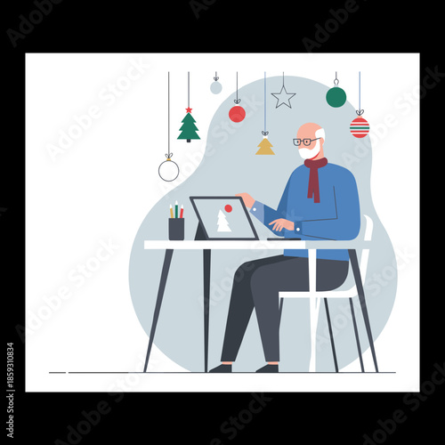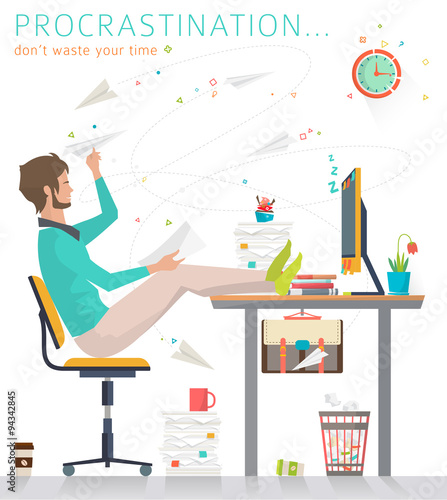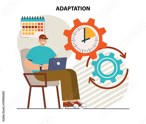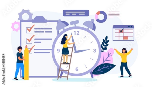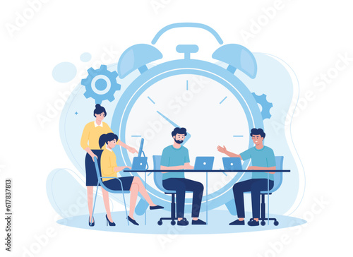 Офисный мужчина работает за ноутбуком. Часы, мишень, бизнес-символы контрольного списка, плоская векторная иллюстрация. Тайм-менеджмент, расписание, планирование задач.