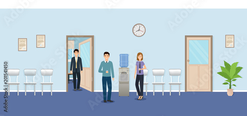 Векторная иллюстрация концепции офисных людей в плоском стиле. Человек, делающий презентацию бизнес-плана, менеджер, офисные работники на рабочем месте и в лифте.