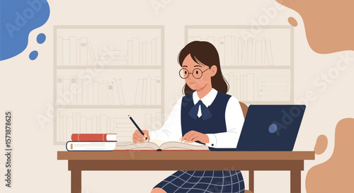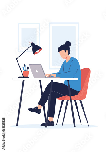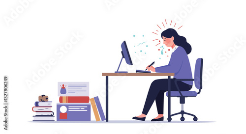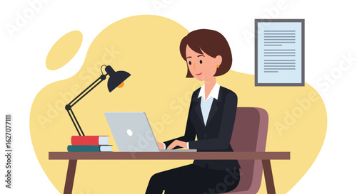 Векторная иллюстрация улыбающейся деловой женщины, сидящей за офисным столом, использующей ноутбук и пьющей кофе. Элемент дизайна в плоском стиле офисных людей, значок, выделенный на белом фоне.