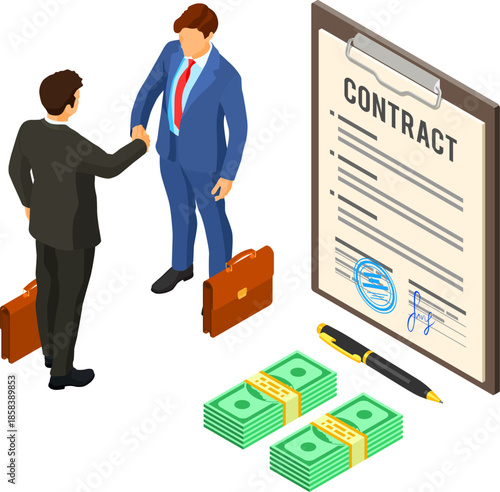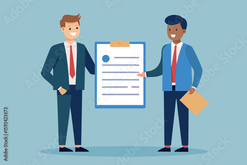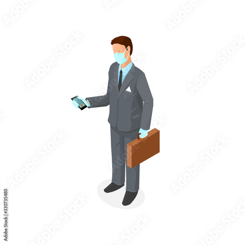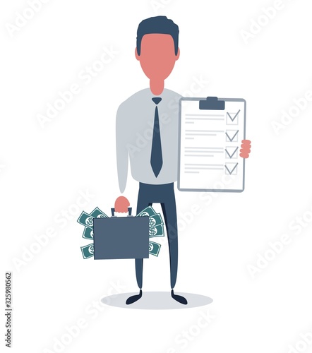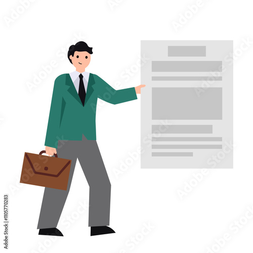 Векторная иллюстрация улыбающегося бизнесмена в костюме, стоящего с красной папкой и портфелем в руках. Элемент дизайна в плоском стиле офисных людей, значок, выделенный на белом фоне.