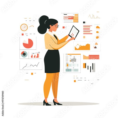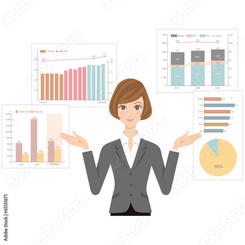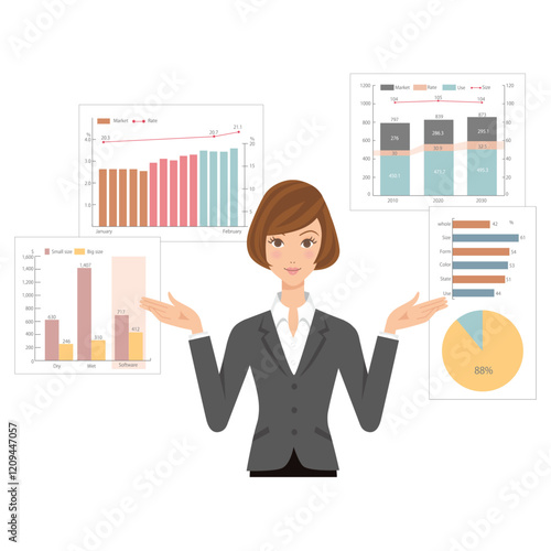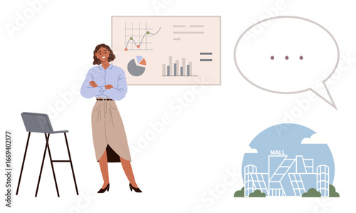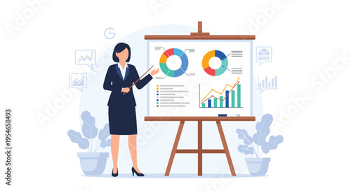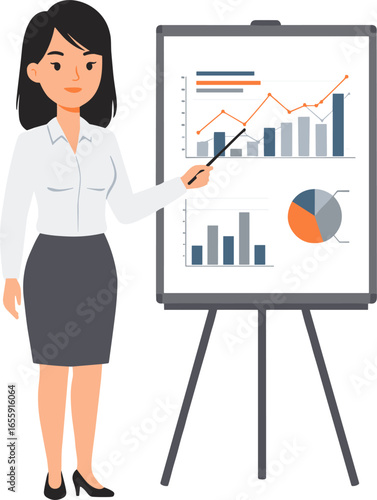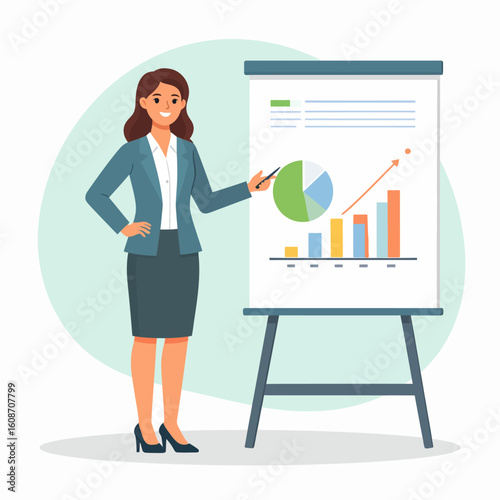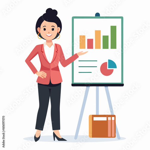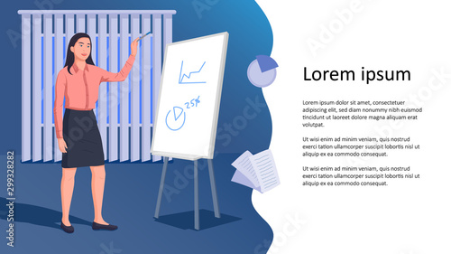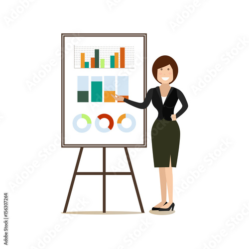 Векторная иллюстрация деловой женщины, дающей презентацию. Женщина-лектор указывает на диаграмму на доске. Элементы дизайна офисных людей в плоском стиле, значки, выделенные на белом фоне.