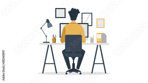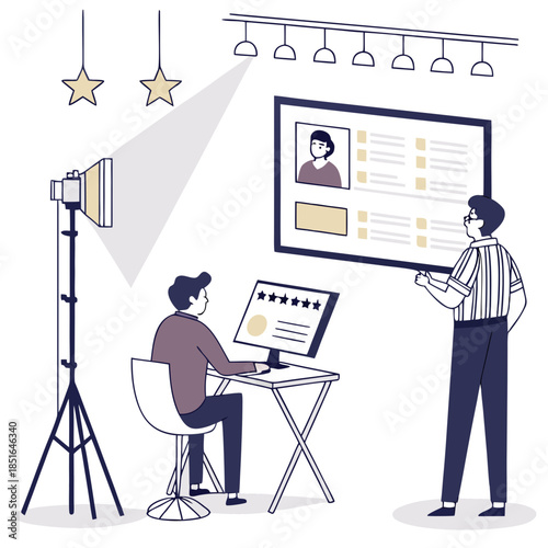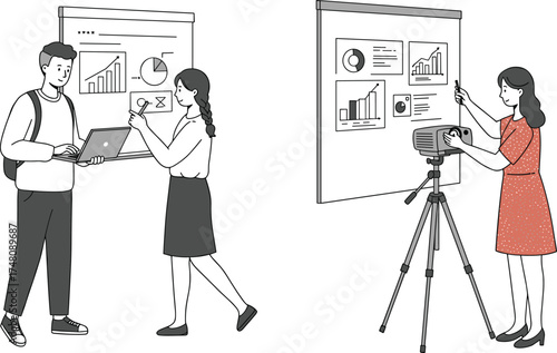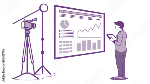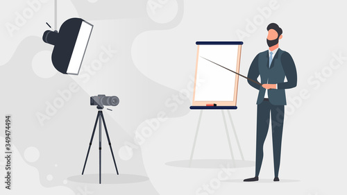 Векторная иллюстрация бизнесмена, дающего презентацию. Лектор-мужчина, указывающий на проекционный экран. Элементы дизайна офисных людей в плоском стиле, значки, выделенные на белом фоне.