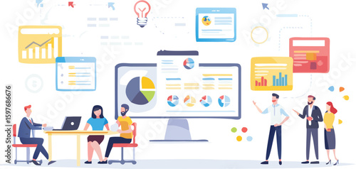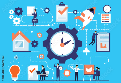 Деловые люди в разных офисных ситуациях, векторная плоская иллюстрация. Миниатюрные персонажи мужского и женского пола работают на ноутбуке, делая перерыв на кофе. Распорядок дня в офисе, состав тайм-менеджмента