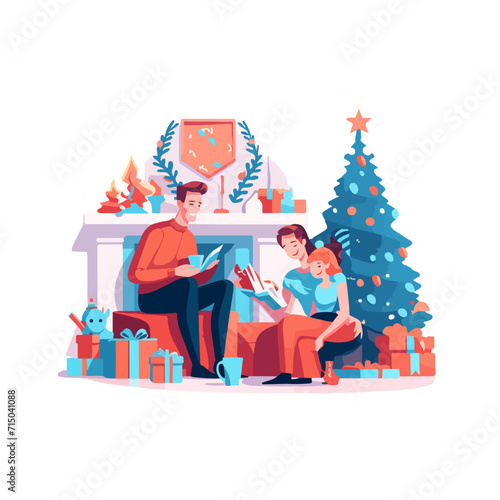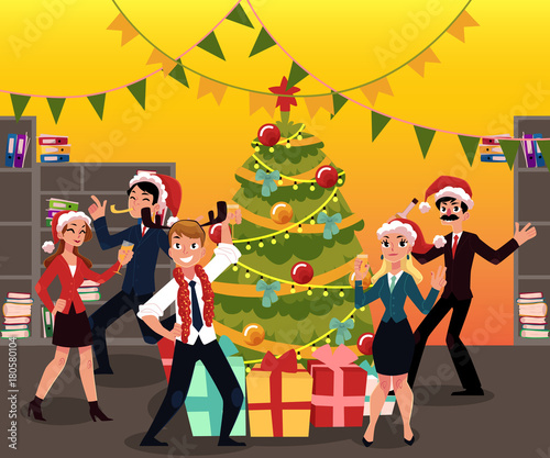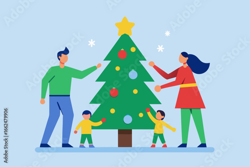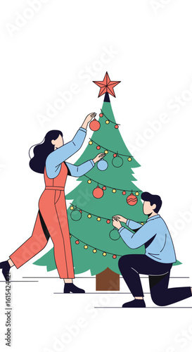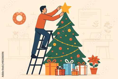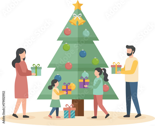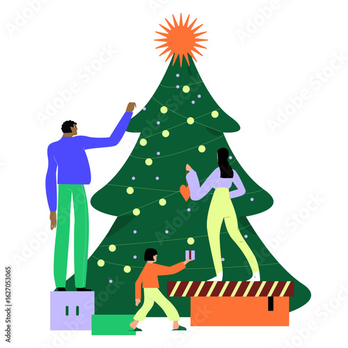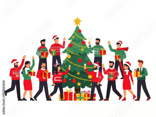 Крошечные офисные люди украшают гигантскую рождественскую елку и готовят подарки, чтобы положить их под елку, плоская векторная иллюстрация. Подготовка к празднованию веселых рождественских и новогодних праздников.
