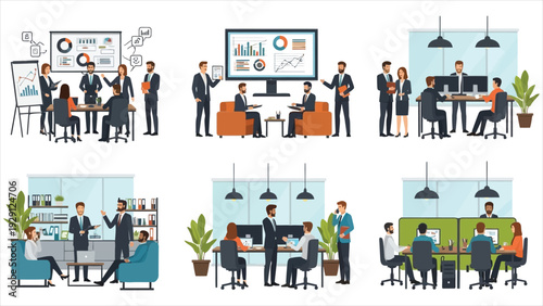 Векторная иллюстрация деловых людей, выступающих с презентацией, принимающих участие в конференции, делающих перерыв на кофе, подписывающих контракт, работающих на компьютере. Офисные люди плоские значки, изолированные на белом фоне