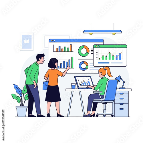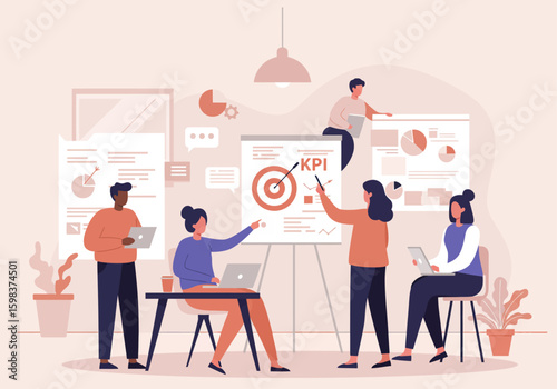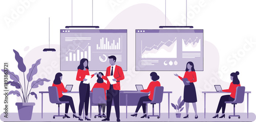 Офисные люди, работающие за компьютером, проводящие презентации, планирующие, управляющие работой с доской scrum kanban, плоская векторная иллюстрация. Гибкая командная работа, гибкое управление проектами, рабочий процесс.
