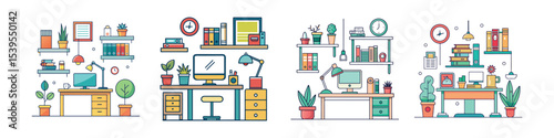 Набор офисных сцен, плоская векторная иллюстрация. Деловые люди, персонажи мужского и женского пола, работающие на компьютерах, практикующие йогу. Интерьер офиса с современными пуфиками, высоким столом, обзорной доской.