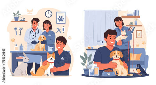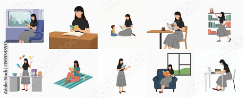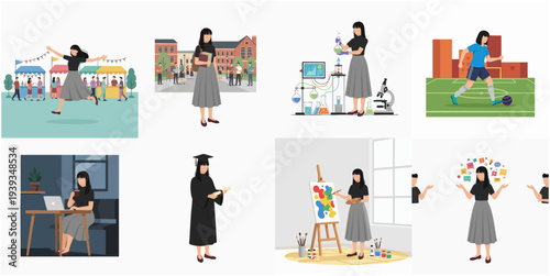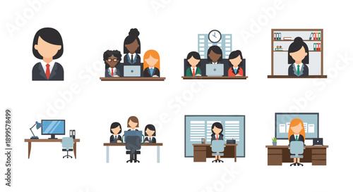 Набор офисных сцен, плоская векторная изолированная иллюстрация. Деловые люди работают за компьютером, делают перерыв на кофе, проводят презентации, встречи, тренинги, планируют свою работу. Офисные ситуации.