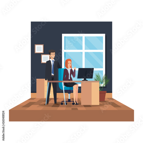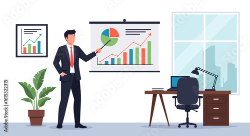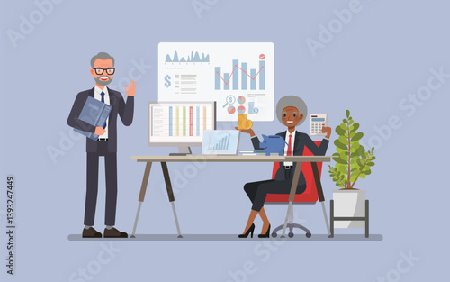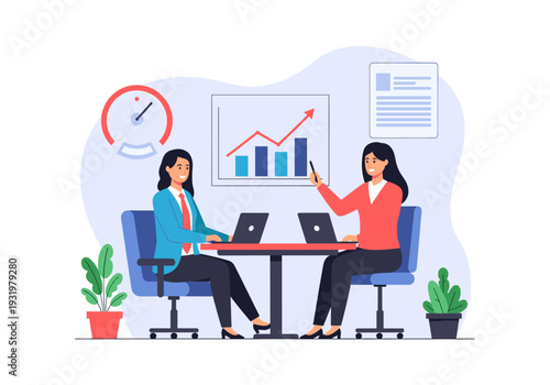 Офисная сцена с современным рабочим местом, две коллеги-деловые женщины делают перерыв на кофе и разговаривают друг с другом, векторная плоская иллюстрация. График работы, время обеда, обстановка в офисе, тайм-менеджмент.