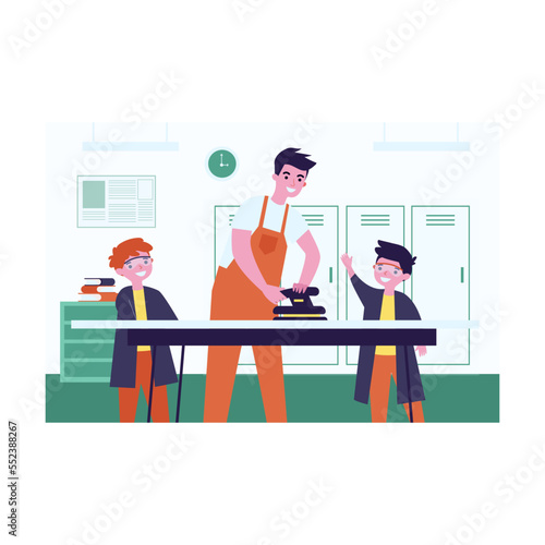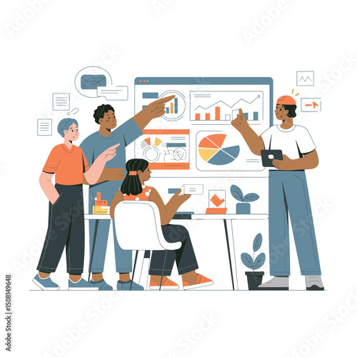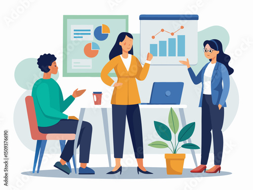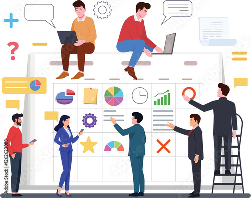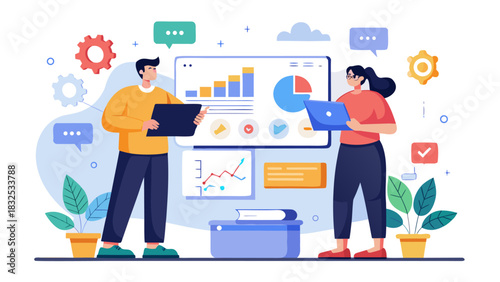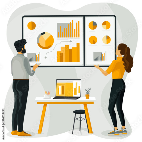Офисная сцена с современным рабочим местом, доска канбан на стене, мужчина и женщина работают над бизнес-проектом, плоская векторная иллюстрация. Гибкая методология Канбана, офисная ситуация, командная работа.