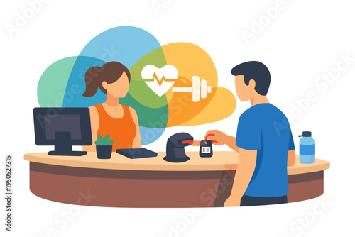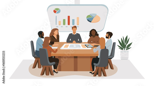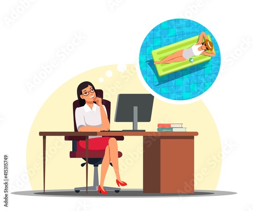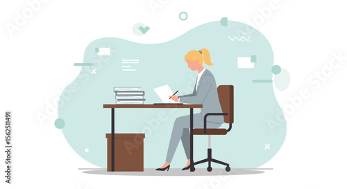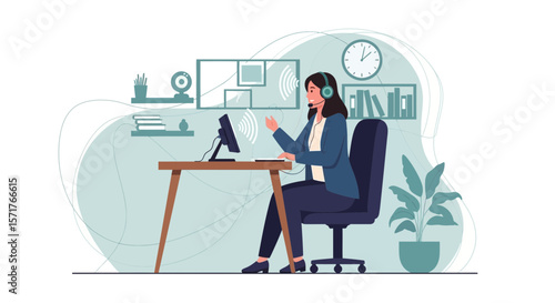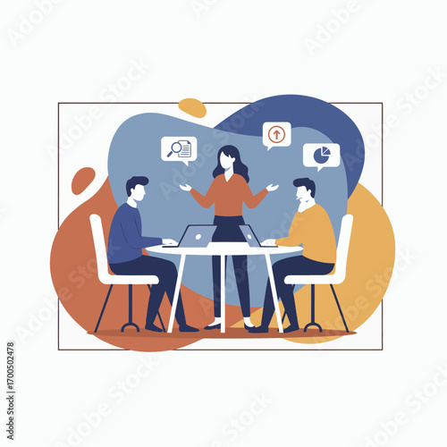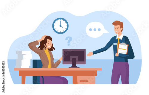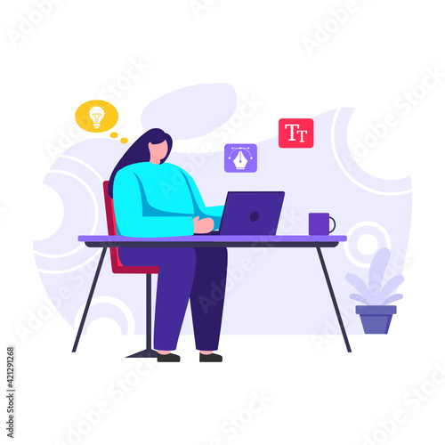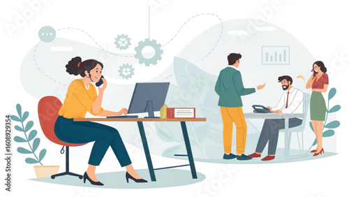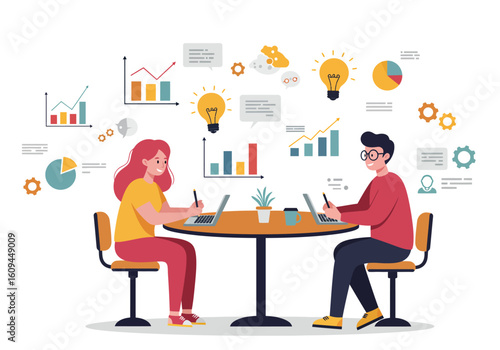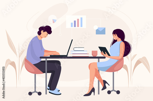 Офисная сцена с современным рабочим местом, две женщины, работающие на портативных компьютерах, пьющие кофе и болтающие, сидя за столом друг напротив друга, плоская векторная иллюстрация. Офисная обстановка, перерыв на кофе.