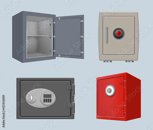 Офисный стальной сейф с реалистичным векторным дизайном. Металлический сейф с цифровым паролем безопасности для доступа к ключу. Закрытый и открытый контейнер для хранения денег и личных документов