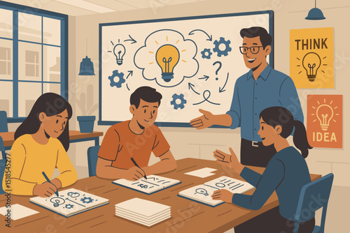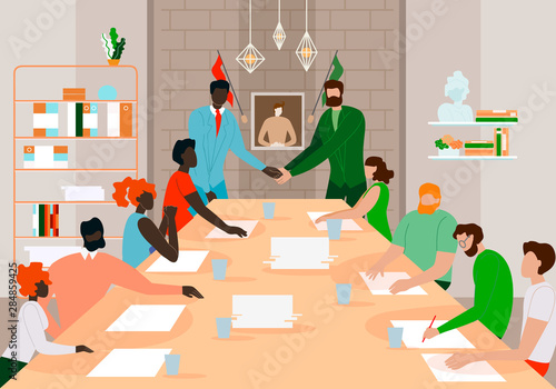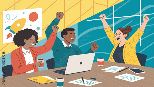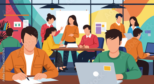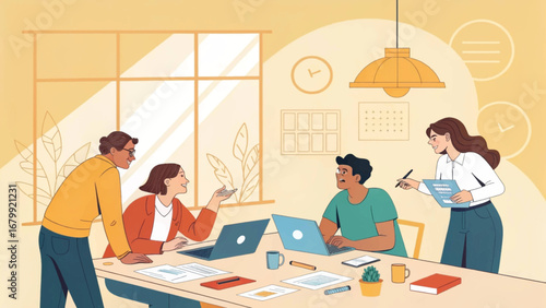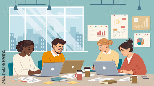 Офисная команда помогает коллеге с ее проектом. Векторная иллюстрация концепции работы бизнес-команды. Мужчина и женщина работают вместе на собрании.