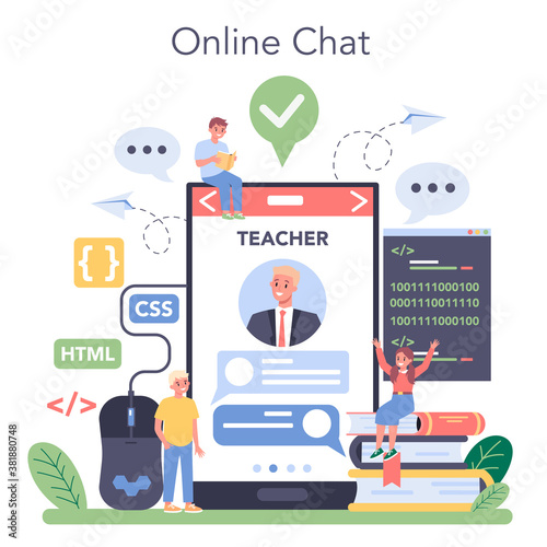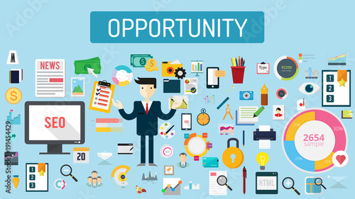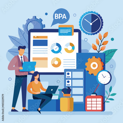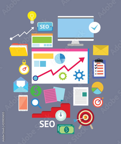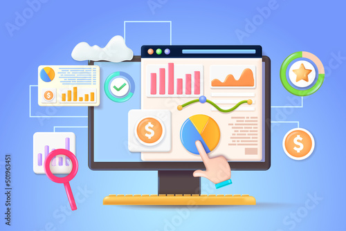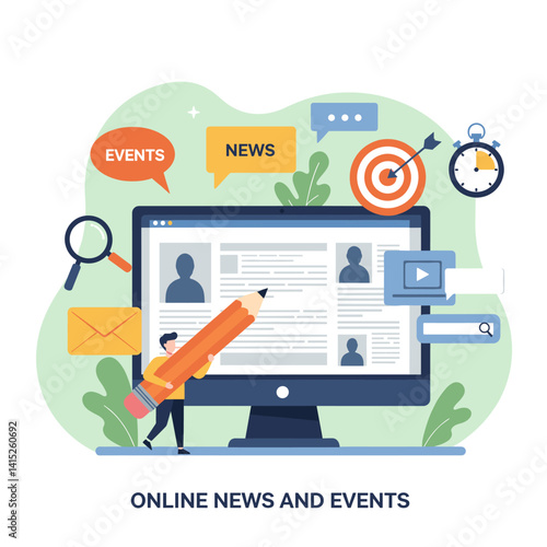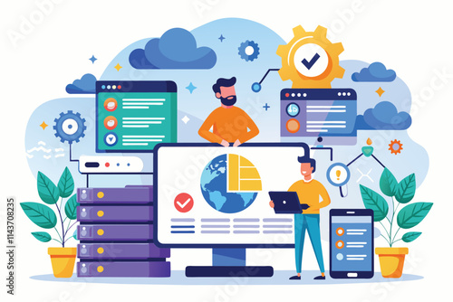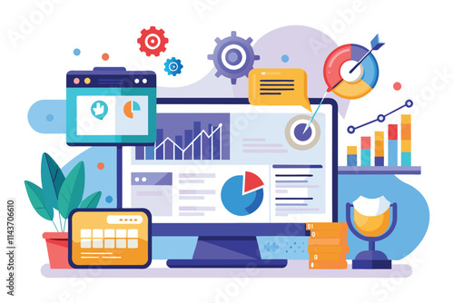 Векторная плоская иллюстрация офисной работы. Настольный компьютер, смартфон, буфер обмена с бланком контракта, канцелярские принадлежности, фотография в рамке и ручной рисунок карандашом на мониторе. Плакат рабочего пространства офиса, баннер.