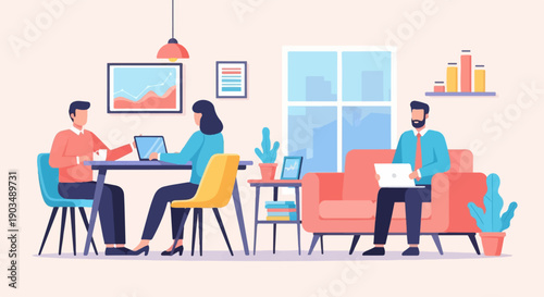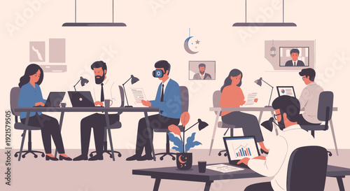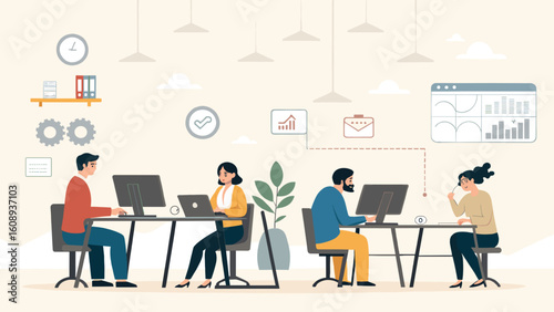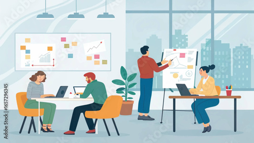 Офисная работа, плоская векторная иллюстрация. Деловые люди проводят презентацию, встречаются и обсуждают проблемы. Партнерство, рукопожатие, семинар, командная работа. Офисные ситуации.