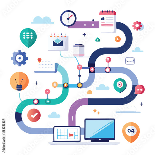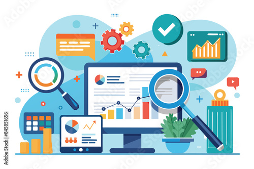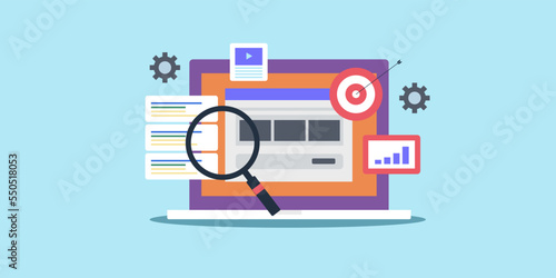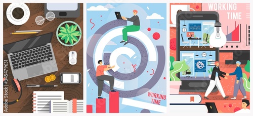 Набор шаблонов векторных плакатов для офисной работы. Современное рабочее место с компьютером, планшетом, канцелярскими принадлежностями, деловые люди, вовлеченные в повседневную работу, офисную рутину. Иллюстрация дизайна в плоском стиле для листовки, баннера и т.Д