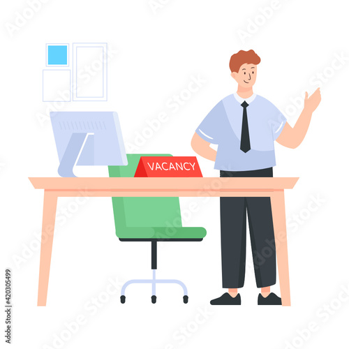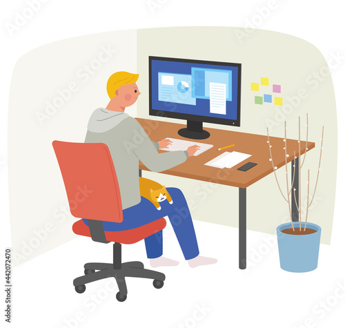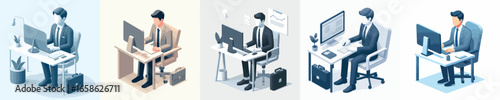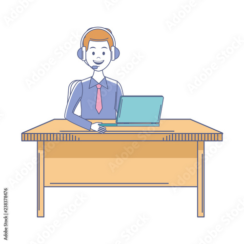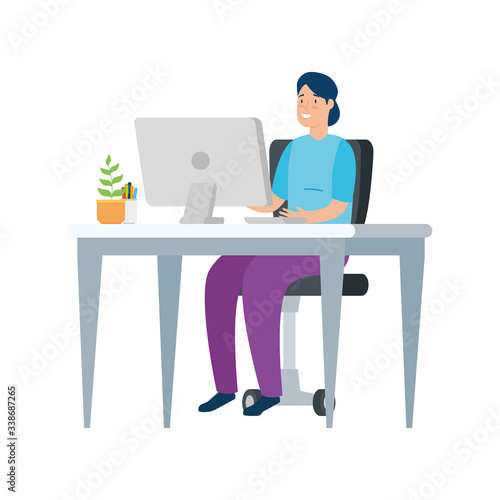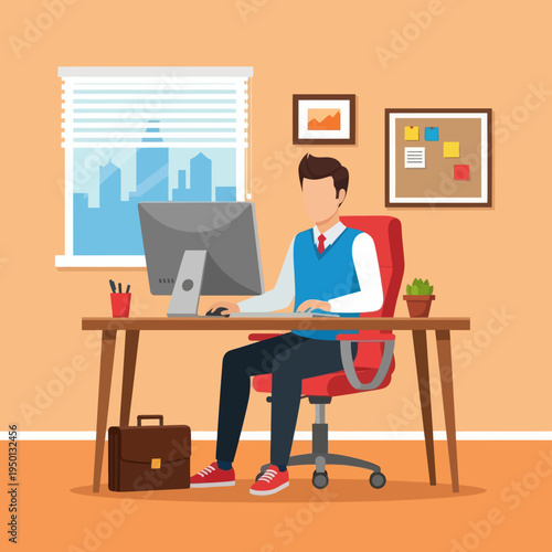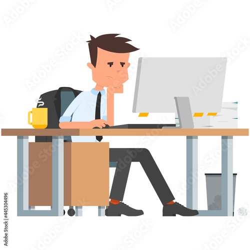 Офисный работник за компьютером с векторной иконкой. Мужчина, сидящий за столом и работающий онлайн, выделен на белом фоне