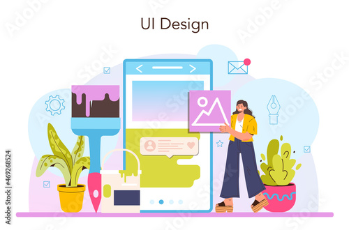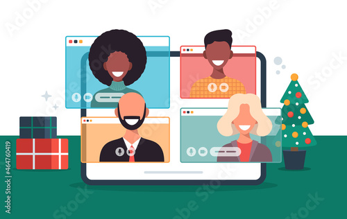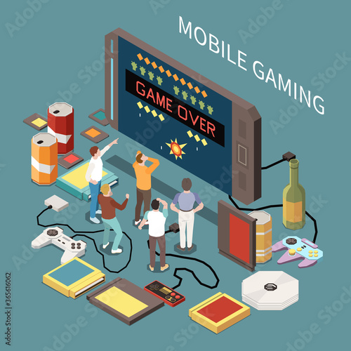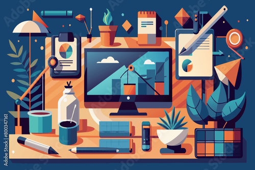 Шаблон векторного плаката для офисной работы. Огромный смартфон, компьютер с рабочим местом, диаграммы на экранах, встреча офисных людей, рукопожатие, работа на портативном компьютере, иллюстрация дизайна в плоском стиле.