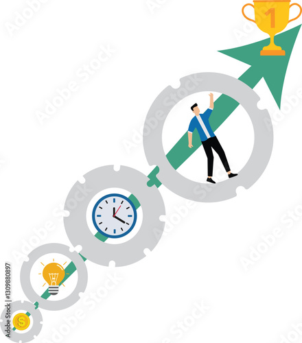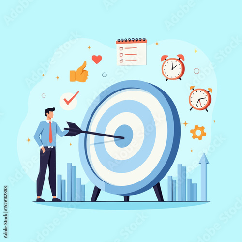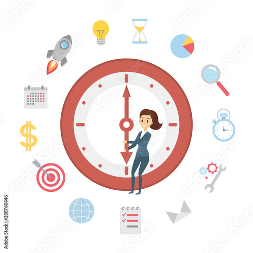 Шаблон векторного плаката рабочего времени. Деловые люди, работающие на ноутбуке, сидя на графике, строят круговую диаграмму, стоя на гистограмме. Аналитика, анализ данных, рабочее время, командная работа, плоская иллюстрация.