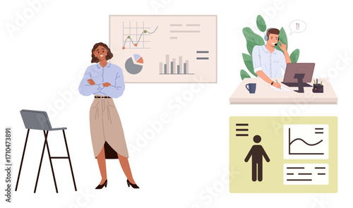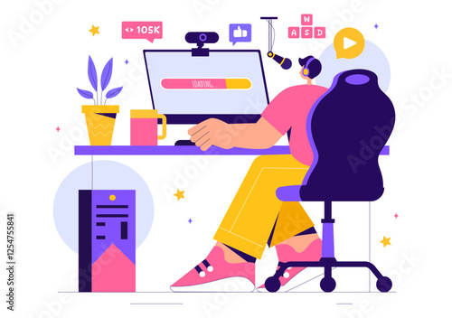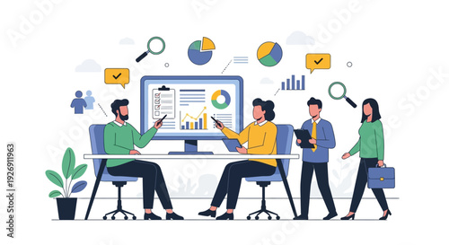 Рабочее пространство, векторная иллюстрация дизайна в плоском стиле. Офисное рабочее место с персонажами, работающими и отдыхающими. Рабочая станция разработчика программного обеспечения, концепция командной работы для веб-баннера, страницы веб-сайта и т.д.