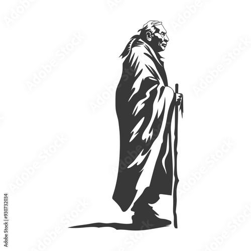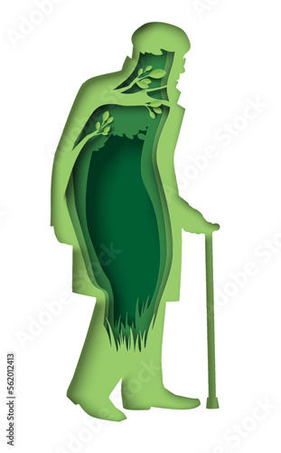 Вектор силуэта старика. Старший с тростью, идущий по вырезанной из бумаги иллюстрации. Пожилые люди, символ пожилого гражданина. Концепция выхода на пенсию, пенсионного обеспечения и материальной поддержки