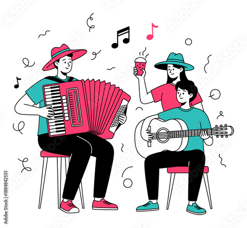 Старые пожилые люди поют векторную иллюстрацию. Пожилой мужчина-музыкант, играющий музыку на аккордеоне, и пожилая женщина-певица. Семейная пара на пенсии проводит досуг и развлечения