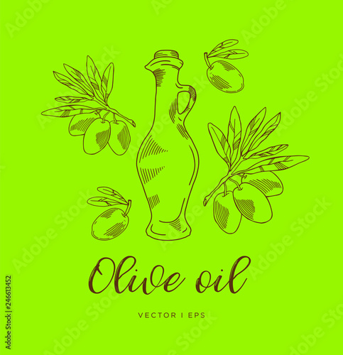 Реклама оливкового масла. Векторная реалистичная иллюстрация макета упаковки стеклянной бутылки с оливковым маслом, нарисованного вручную чернилами оливкового плода, ветви, дерева и стеклянного кувшина с оливковым маслом.