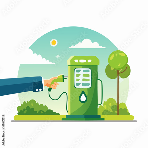Макет стеклянной бутылки оливкового масла на выставочном подиуме, вырезанные из бумаги ветви оливкового дерева с ягодами, поля, векторная иллюстрация. Шаблон рекламы натуральных продуктов здорового питания.